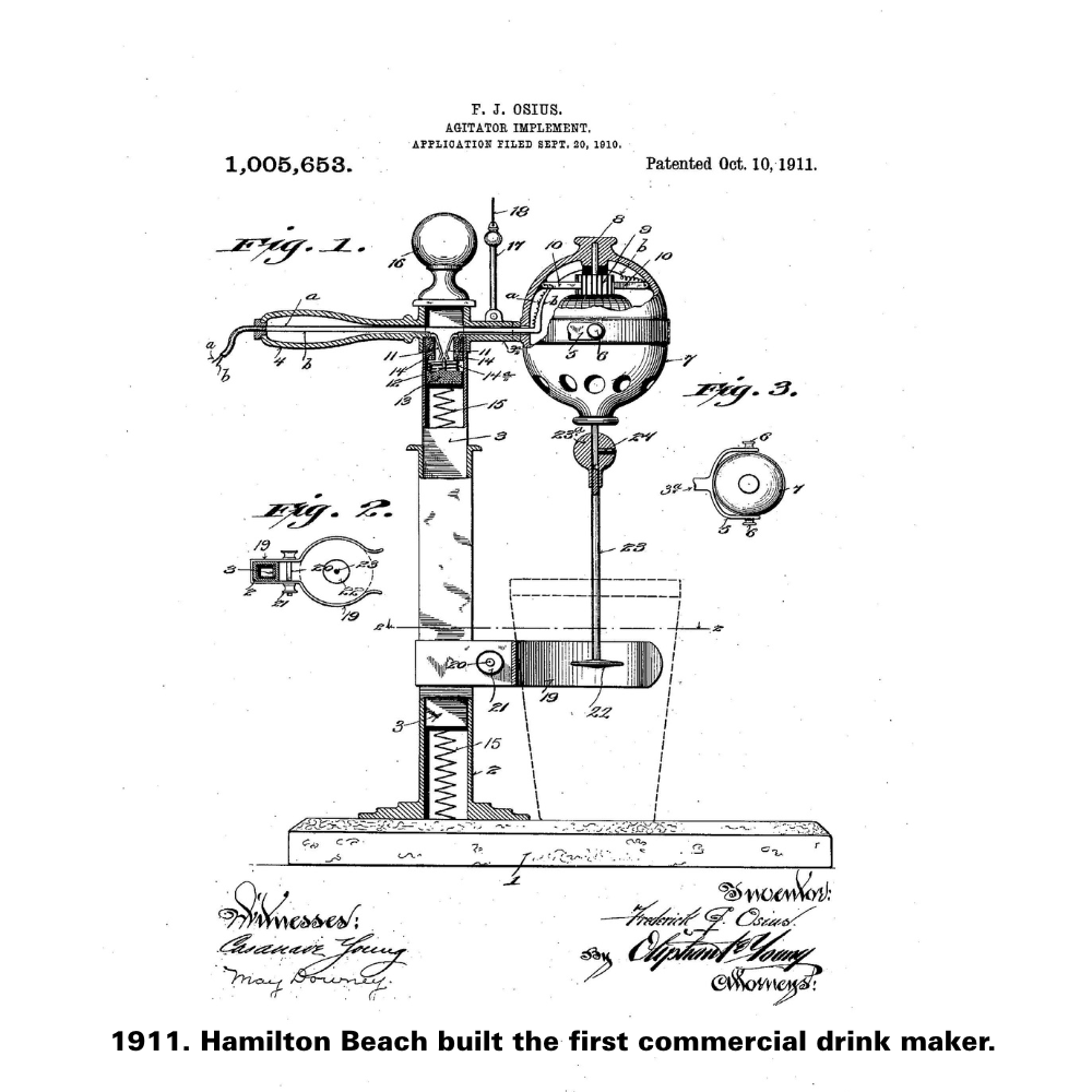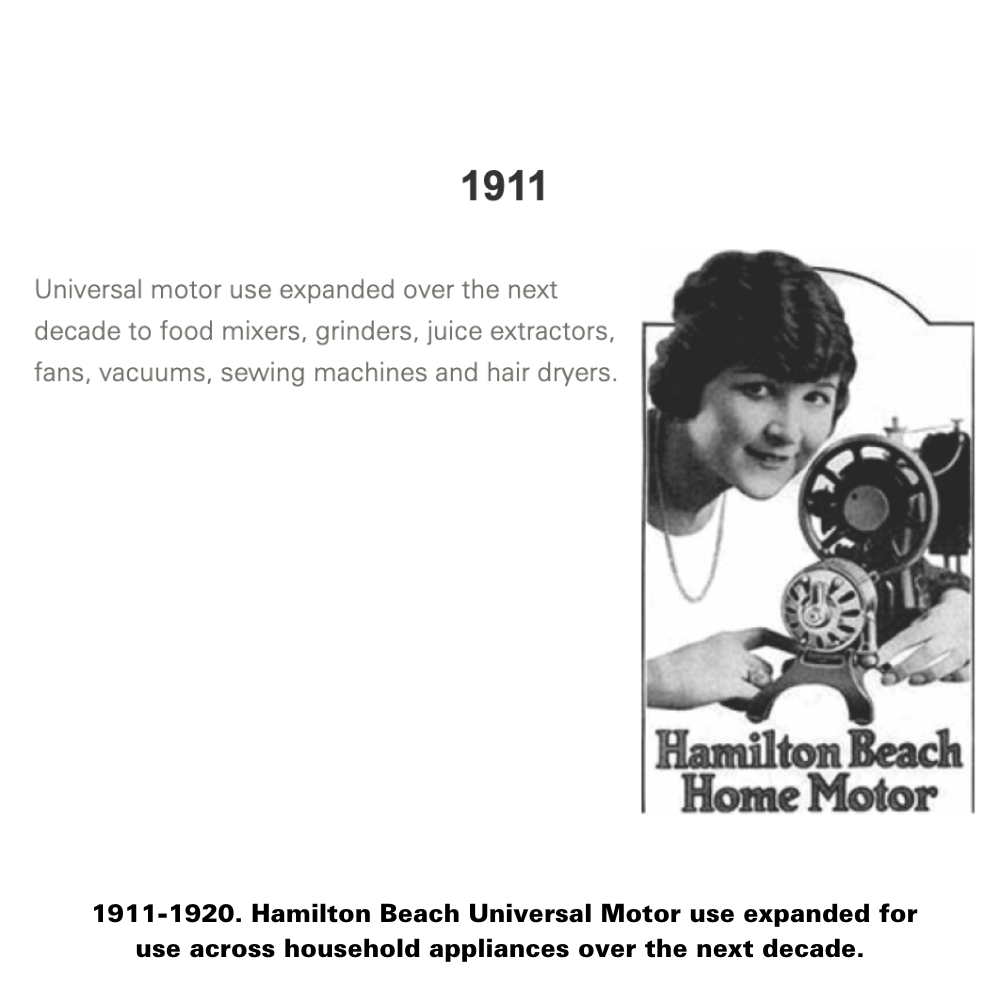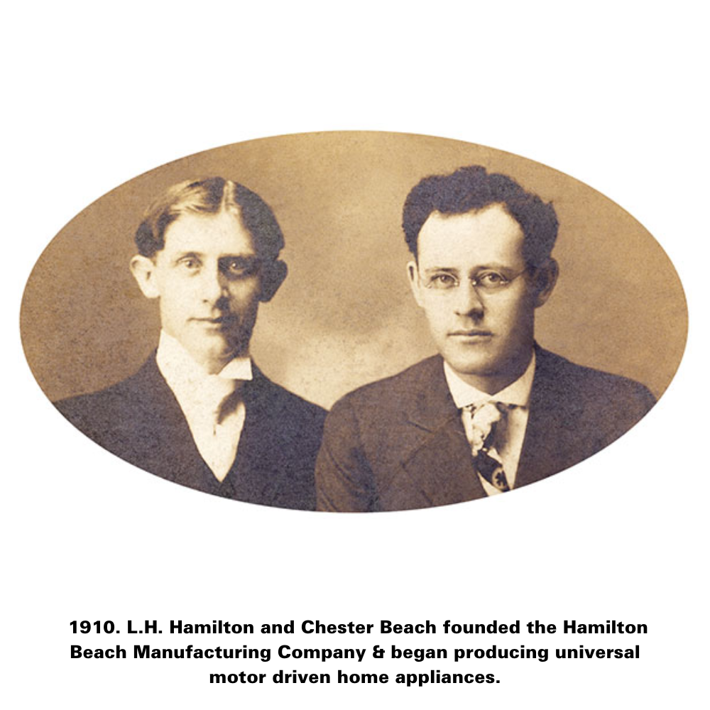 In 1904, L.H. Hamilton and Chester Beach both worked for U.S. Standard Electrical Works in Racine, Wisconsin. The business manufactured electrical devices and began to develop a line of motor operated products for household use. At the time, electric motors were only used in commercial applications. Chester Beach developed an innovative lightweight universal motor used for appliances in the home. The Hamilton Beach Manufacturing Company was founded in 1910 and began to produce universal motor-driven appliances, including the now iconic Drink Mixer. Hamilton Beach’s product line expanded to include food mixers, juice extractors, fans, floor polishers, meat grinders, and even jewelers’ motors.